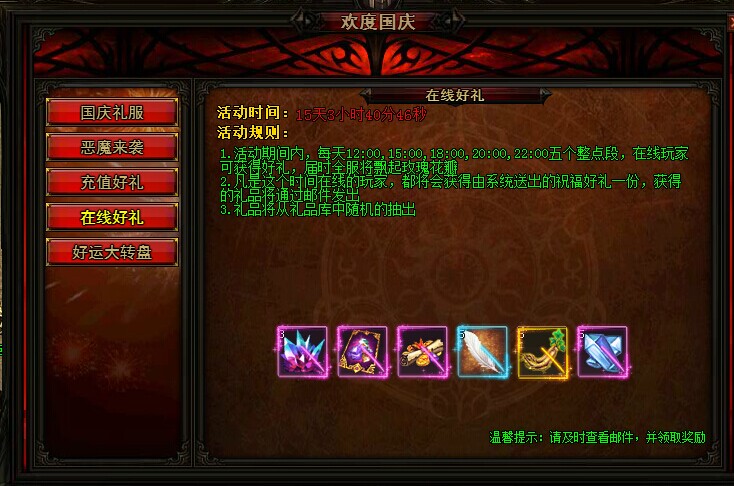 活动详情:活动期间每天12:00、15:00、18:00、20:00、22:00五段整点时间在全服将会飘起玫瑰花雨;凡是在此时间在线的玩家均可以获得《暗黑屠龙》为各位精心准备的精美礼品一份;礼品将通过邮件发送。