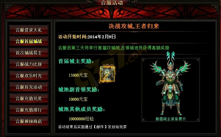 首届城主可获得 10000元宝、2转神装衣服(游戏顶级神装,根据性别和职业不同,对应发放)