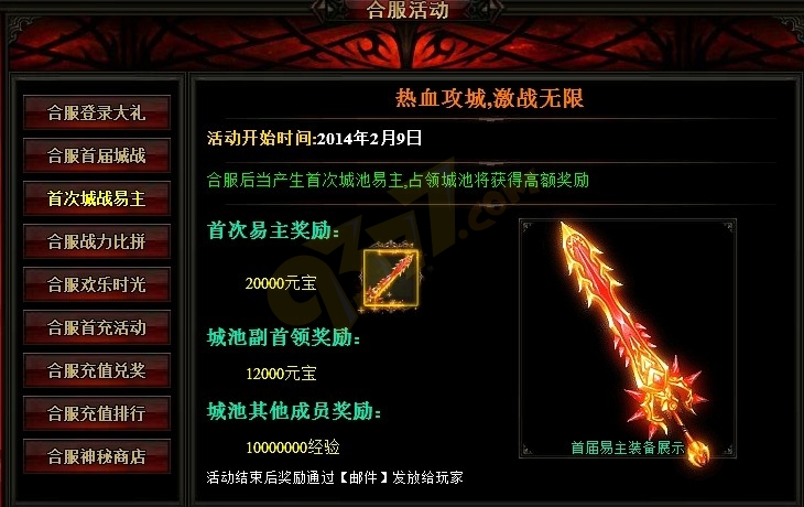 首届城主可获得 20000元宝、2转神装武器(游戏顶级神装,根据职业不同,对应发放)