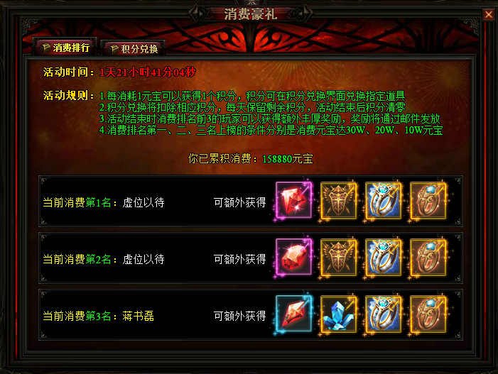 3、活动结束时消费排名前3的玩家可以获得额外丰厚奖励,奖励将通过邮件发放;