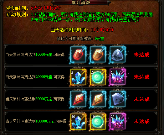 活动详情:活动期间内,累计消费达到指定要求的玩家,可获得道具奖励。累计消费梯度分别为10000元宝、 20000元宝、50000元宝、100000元宝。每日24:00结算一次,次日玩家的累计消费额将重新统计。活动奖励在24:00结算时以邮件的形式发放,每日一发。