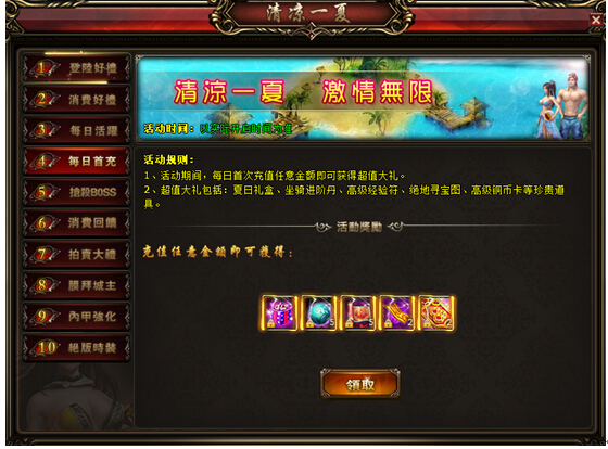 活动详情:活动期间,每日首次充值任意金额即可获得夏日礼盒、高级经验符、绝地寻宝图等珍贵大礼。