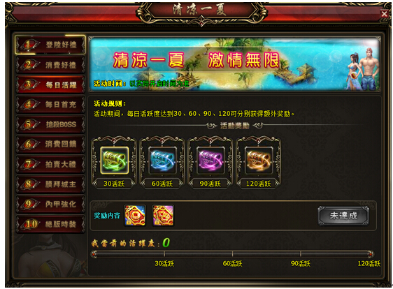 活动详情:活动期间,每日活跃度达到30、60、90、120可以分别获得额外奖励。