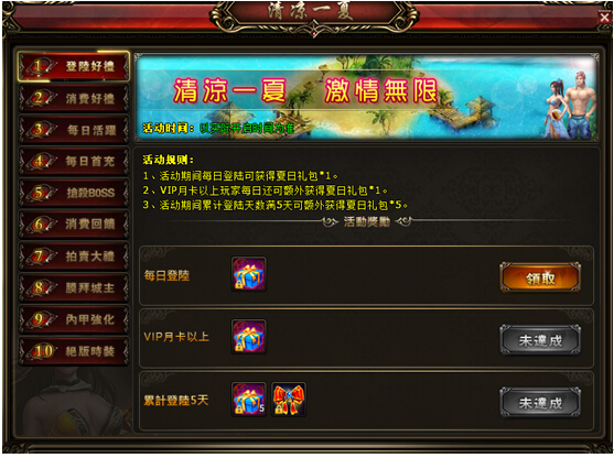 活动详情:活动期间玩家登陆游戏即可获得每日登录奖励,VIP月卡以上玩家每日可以领取额外奖励,活动期间累计登陆5天玩家可以获得豪华大礼包。