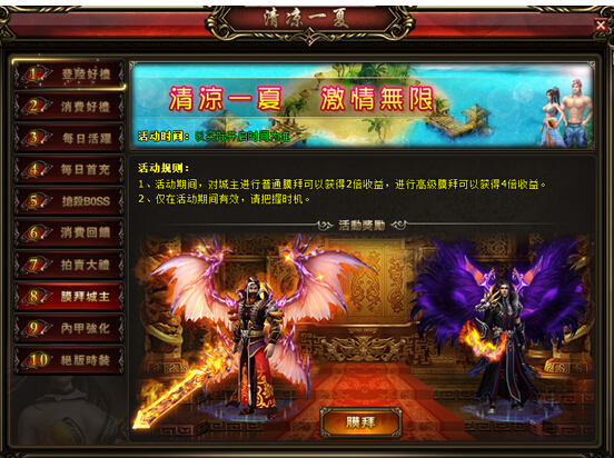 活动详情:活动期间,对城主进行普通膜拜可以获得2倍收益,进行高级膜拜可以获得4倍收益。