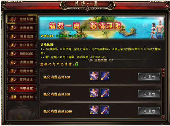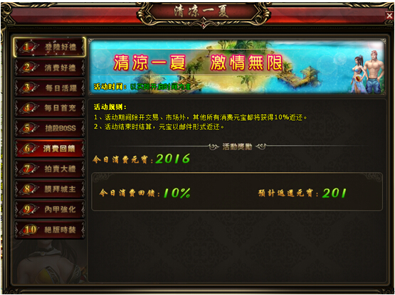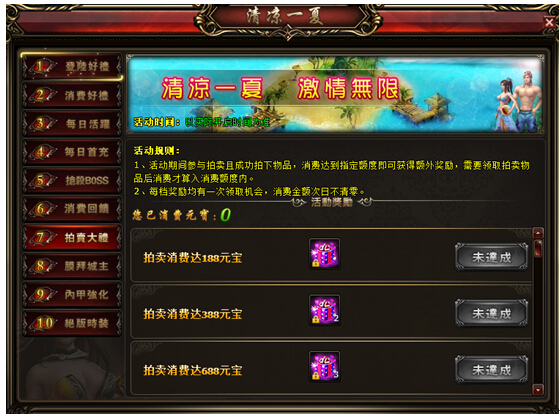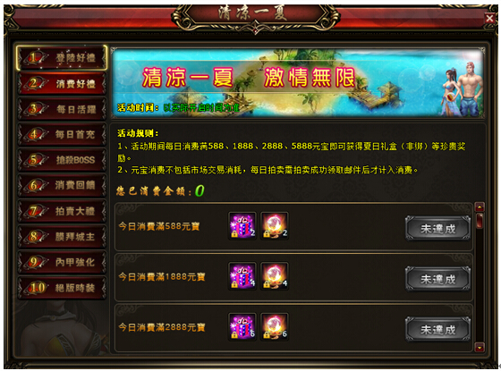 活动详情:活动期间每日消费到达指定额度即可领取夏日礼盒(非绑)奖励,元宝消费不包括市场交易消耗,每日拍卖需拍卖成功领取邮件后才计入消费。