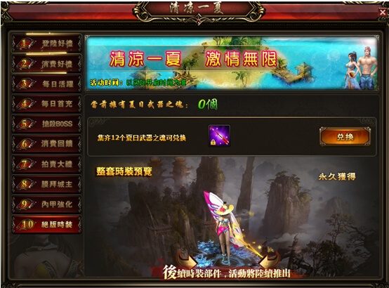活动详情:活动期间,集齐12个夏日武器之魂即可兑换绝版时装夏日武器。够拉风,够酷炫,夏日套装缺一不可哦。