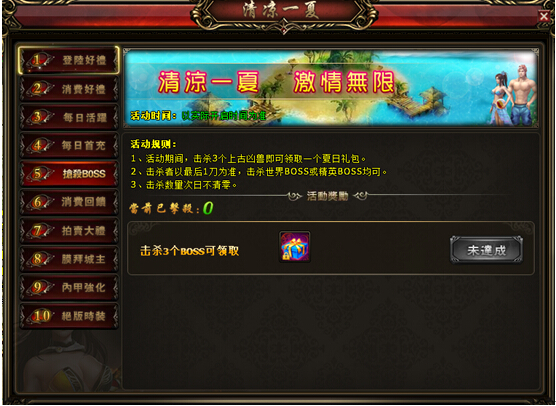 活动详情:活动期间,每击杀3个上古凶兽即可领取一个夏日礼包,击杀者以最后1刀为准,击杀世界BOSS或精英BOSS均可,击杀数量次日不清零。