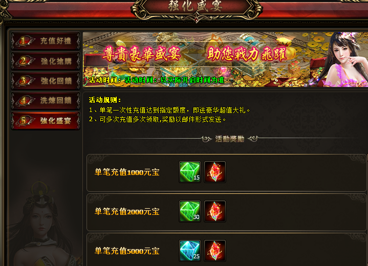 活动详情:单笔一次性充值达到指定额度,即送豪华超值大礼,多次充值可多次领取,奖励以邮件形式发送。