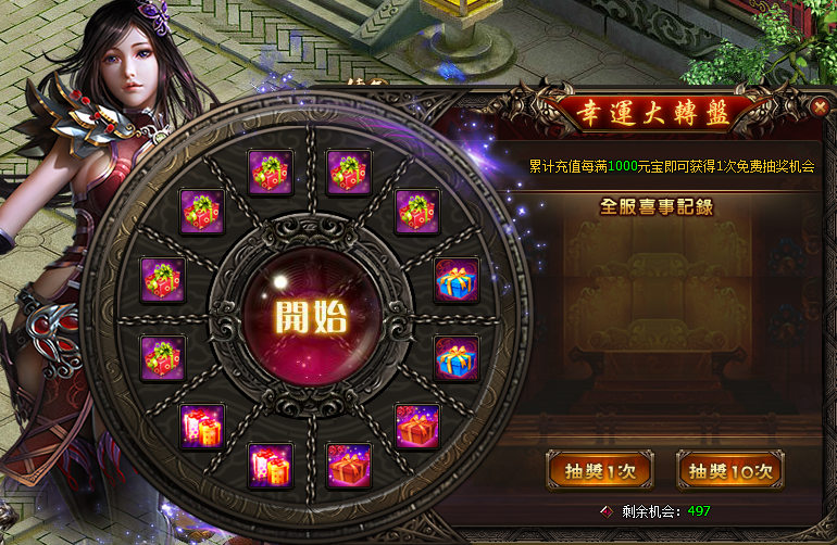 活动详情:活动期间,累计充值满1000元宝即可获得1次转盘机会。转动转盘必定获得豪华礼包,更有几率开出极品超级礼包,奖励非常丰厚!