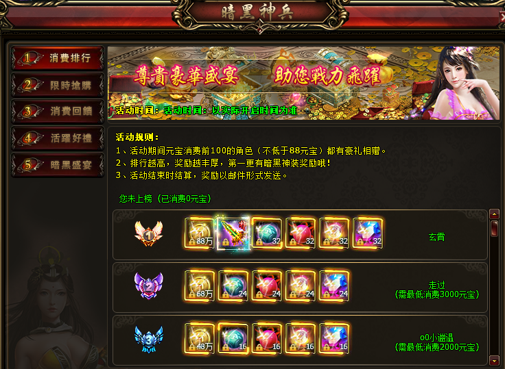 活动详情:活动期间元宝消费排行前100的角色(不低于88元宝)都有豪礼相赠。排行越高,奖励越丰厚,第一更有暗黑神兵奖励(随机开启1件暗黑武器/饰品/戒指/项链)。