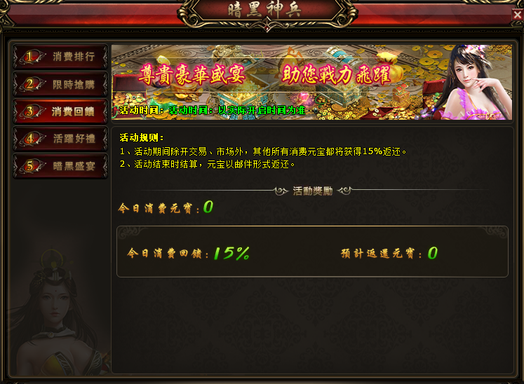 1、 活动期间除开交易、市场外,其他所有消费元宝都将获得15%返还;