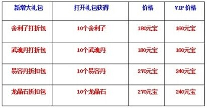 活动期间,限时活动面板抢购 新增大礼包 全新上架,所有玩家可9.5折购买打折包,VIP玩家更可拥有8.5折的优惠。仅在活动期间内才能购买获得,机会不容错过!