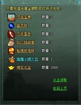 4、建议非RMB玩家随便充值个1元钱以上,这个钱对于任何玩家来说,都是很无所谓的。但是就能领到很实惠的奖品:双倍宝典*1、神殿令牌*1、极品 天书*1、绑定元宝*2000、绑定金币*200000,以上的任何一个物品都是很实惠的。(附作用:极品天书,吃完得到时间1小时内,你打出的任何装备 都是加属性的极品。神殿令牌将在下面打装备的时候解说)