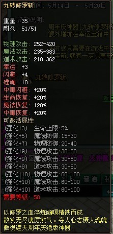 九转修罗斩周年庆绝版武器.对于之前一直拿的九殇的玩家这把武器是最好的选择.在活动时间中可以获得,活动之后只能和其他玩家购买或者是爆对方玩家了.