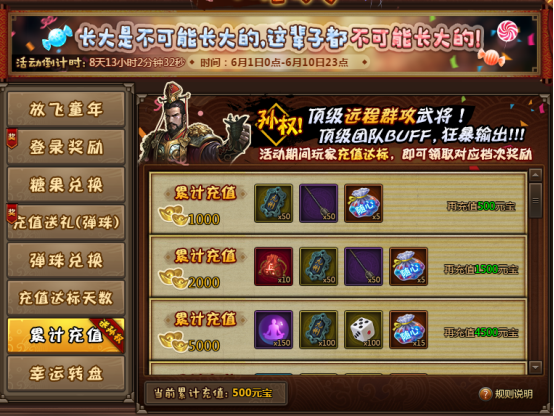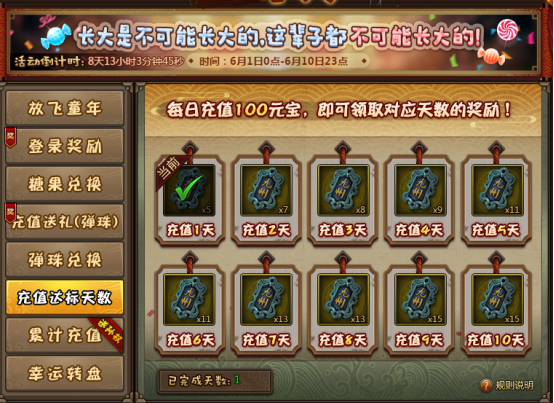 活动期间,单日充值达到100元宝即计算为1个累计充值天数,累计充值天数达到对一个天数即可领取相应奖励,间断不清空