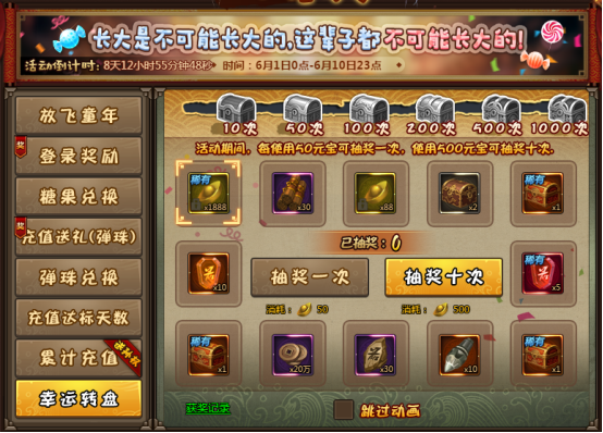 活动期间每使用50元宝可抽奖1次;使用500元宝,可抽奖10次。