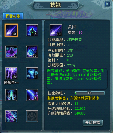 技能的升级需要玩家达到一定等级,会消耗部分铜钱,并根据技能熟练度来决定消耗的经验值。