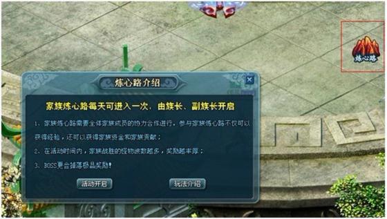 3、每日只能参加1次。当日在其他家族参与过炼心路的族长或副族长,不能再开启活动。可以任命没有参加过的族员为副族长来开启,但当日更换家族,并参与过炼心路的家族成员,不能进入炼心路。