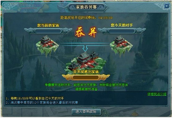 3、开服后每天晚上20:25,系统会为每个家族自动匹配一个对手进行战斗,战场持续10分钟,胜利的家族将吞并失败的家族,当天吞并战结束后,系统会根据家族人数上限踢出部分的成员;