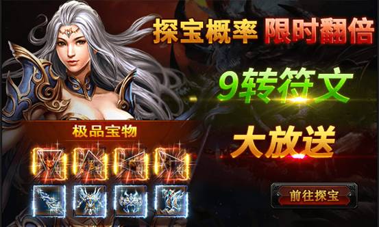 活动期间内,探宝概率翻倍;并有较大概率获得9转符文、霸王神装、等极品道具!