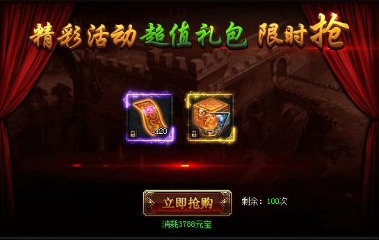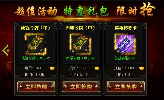 活动期间,可购买超优折扣每日限购礼包,英雄转职卡、印记灵魄、探宝符、羽毛、魂玉结晶、护盾结晶、暗器结晶、成就令牌、声望令牌等极品道具仅限活动期间跳楼优惠!