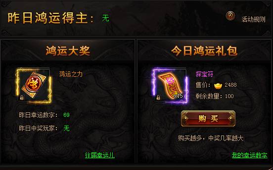 活动期间,购买限购礼包赢取幸运大奖,奖励极品限时称号。(全服限量买到即赚到)购买礼包越多,中奖几率越大!