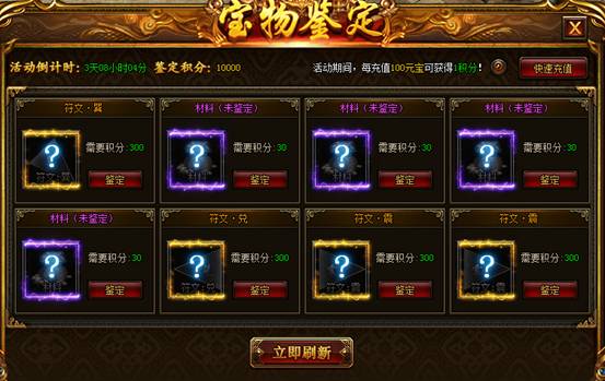 活动期间,每充值100元宝可以获得1鉴定积分!界面中会生成未鉴定宝物,消耗鉴定积分鉴定后随机获得对应列表中的一个宝物!极品宝物包括,16转装备、9转符文等!鉴定积分在活动结束后清空,请务必使用完毕!