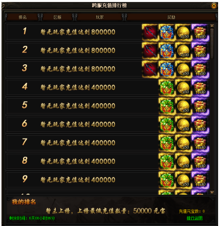 活动期间,玩家充值提前元宝达到特定元宝即可登上排行,活动结束时排行玩家可获得精美道具。所有奖励在活动结束时发放奖励。活动会在最后一日23:59:00秒开始统计结算,请玩家勿在最后一分钟充值,有可能不统计。(注:因数据量较大,排行榜仅会在整点时刻刷新,请玩家谅解)