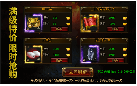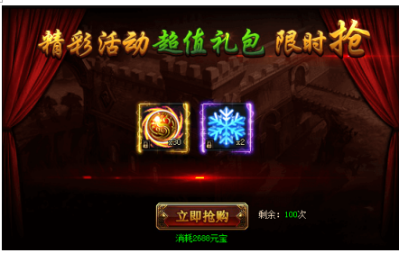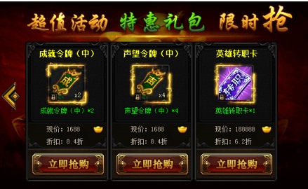 活动期间,可购买超优折扣每日限购礼包,英雄转职卡、印记灵魄、探宝符、羽毛、魂玉结晶、护盾结晶、暗器结晶、成就令牌、声望令牌等极品道具仅限活动期间跳楼优惠!