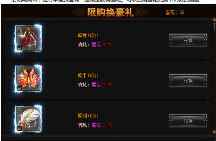活动期间内,进行幸运探宝有一定概率获得雪花。可以使用雪花兑换下列极品奖励!