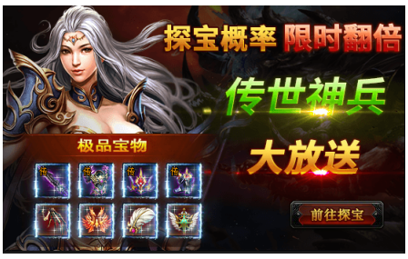 活动期间内,探宝概率翻倍;并有较大概率获得传世神兵、霸王神装、翅膀装备等极品道具!