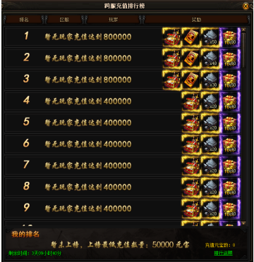 活动开启期间,活动期间,开启跨服充值排行榜,排行榜前50名玩家可获得精美道具奖励,排行榜前三的玩家可“跨服王者”称号。所有奖励在活动结束时发放奖励。活动会在最后一日23:59:00秒开始统计结算,请玩家勿在最后一分钟充值,有可能不统计。(注:因数据量较大,排行榜仅会在整点时刻刷新,请玩家谅解)。