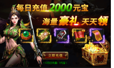 活动期间内,每天充值2000元宝可以领取1000W经验,时装兑换卷,成就令牌,探宝符、8小时三倍经验符等海量道具!
