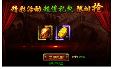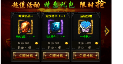 活动期间,可购买超优折扣每日限购礼包,神戒结晶、蓝色妖姬、传承之力、龙纹精华、印记灵魄、探宝符、羽毛、魂玉结晶、护盾结晶、暗器结晶、成就令牌、声望令牌等极品道具仅限活动期间跳楼优惠!