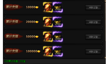 活动期间,每日累计充值指定数额元宝即可领取奖励!