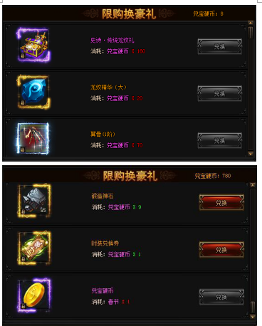 活动期间内,进行幸运探宝有一定概率获得兑换硬币。可以使用兑换硬币兑换下列极品奖励!