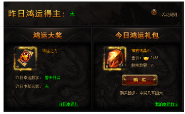 活动期间内,每天每服限购100份鸿运礼包,购买鸿运礼包,即有机会抽取每日鸿运大奖(温馨提示:购买的数量越多中奖几率越高。)。