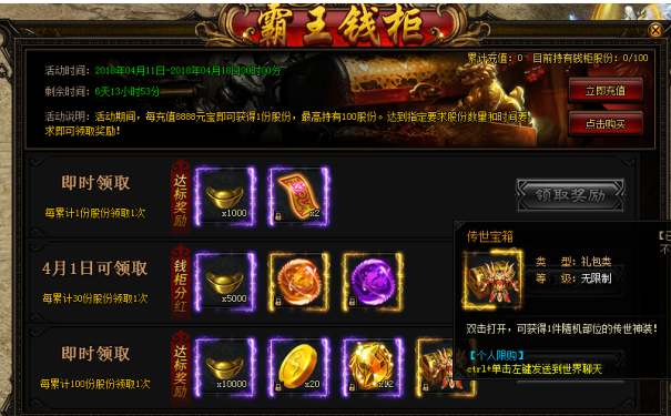 活动开启期间,每充值8888元宝即可获取1份股份,最高持有100股份。达到指定要求股份数量和时间要求即可领取奖励!