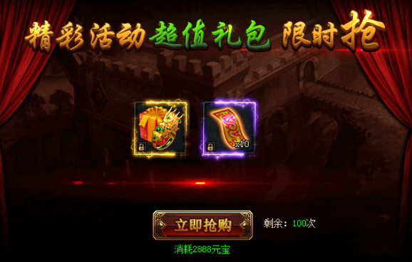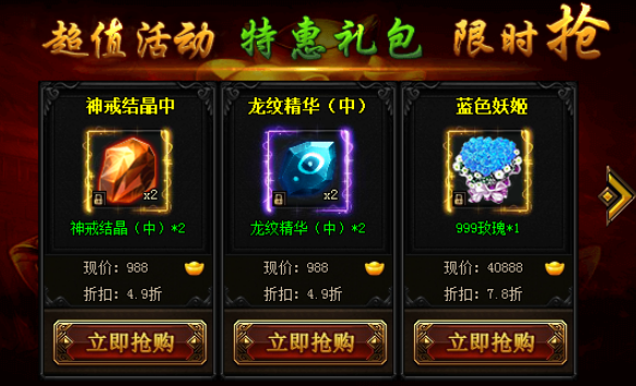 活动期间,可购买超优折扣每日限购礼包,神戒结晶、蓝色妖姬、传承之力、龙纹精华、印记灵魄、探宝符、羽毛、魂玉结晶、护盾结晶、暗器结晶、成就令牌、声望令牌等极品道具仅限活动期间跳楼优惠!