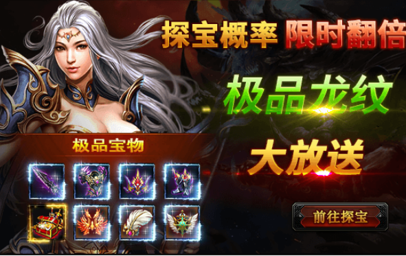 活动期间,探宝概率限时翻倍,并有较高概率获得霸王神装、高转装备等珍稀道具!