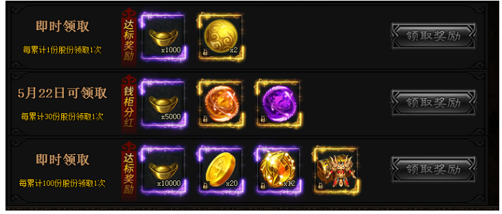 活动期间,每充值8888元宝即可获得1份股份,最高持有100股份。达到指定要求股份数量和时间要求即可领取奖励!