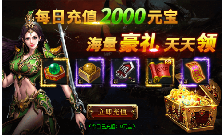 活动期间内,每天充值2000元宝可以领取1000W经验,高级属强丹,成就令牌,探宝符、8小时三倍经验符等海量道具!