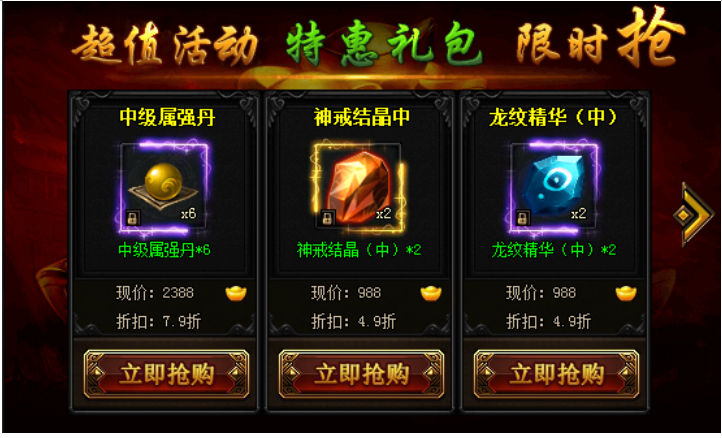 活动期间,可购买超优折扣每日限购礼包,神戒结晶、中级属强丹、传承之力、龙纹精华、印记灵魄、探宝符、羽毛、魂玉结晶、护盾结晶、暗器结晶、成就令牌、声望令牌等极品道具仅限活动期间跳楼优惠!