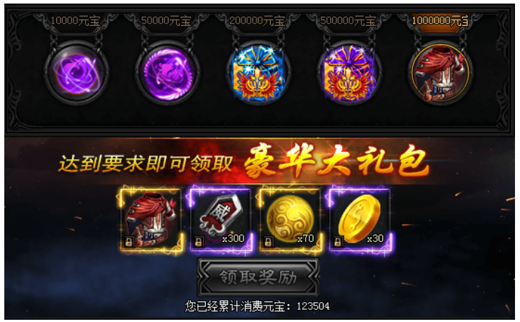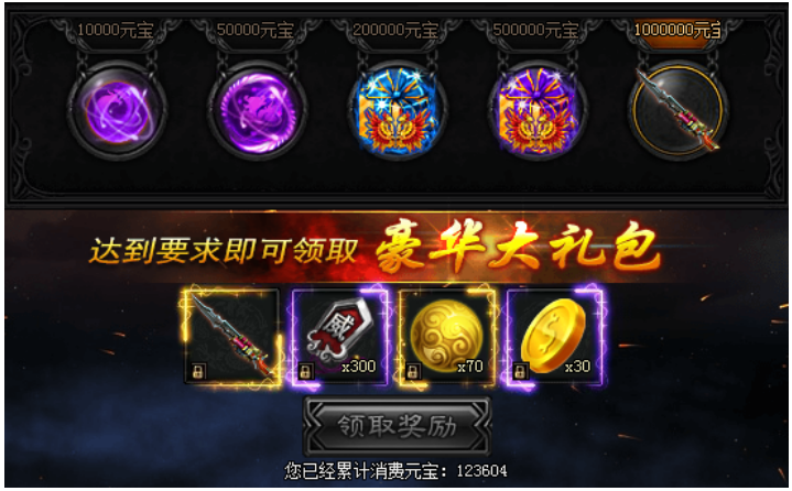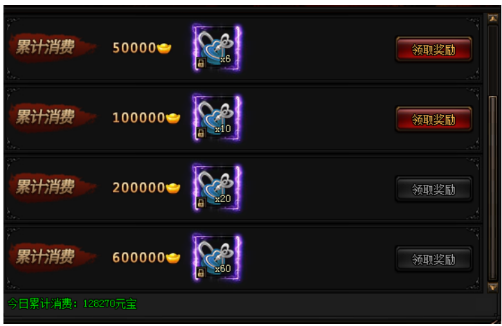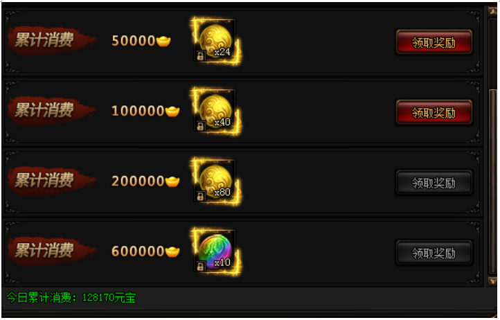 活动期间内,玩家累计消费元宝数额即可领取奖励。
