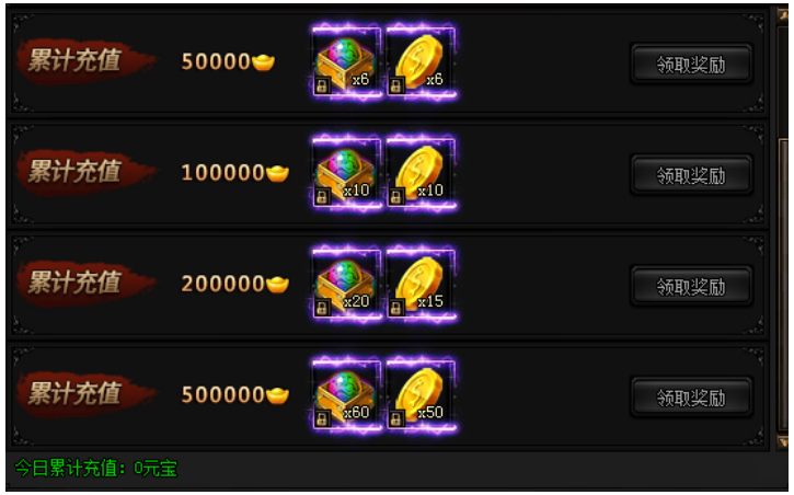 活动期间,每日累计充值指定数额元宝即可领取奖励!