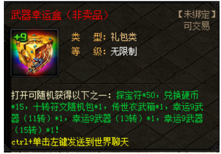礼包内容:打开可随机获得以下奖励之一:探宝符*50、兑换硬币*15、随机10转符文礼包、传世衣武箱、幸运9武器(11转)、幸运9武器(13转)、幸运9武器(15转)