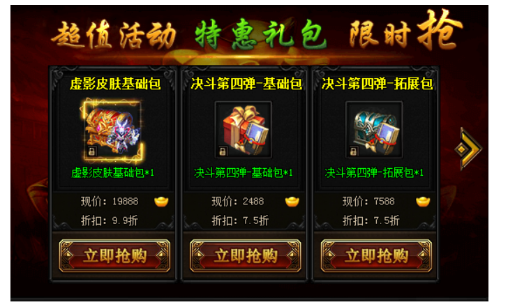 活动期间,可购买超优折扣每日限购礼包,神戒结晶、中级属强丹、传承之力、龙纹精华、印记灵魄、探宝符、羽毛、魂玉结晶、护盾结晶、暗器结晶、成就令牌、声望令牌等极品道具仅限活动期间跳楼优惠!