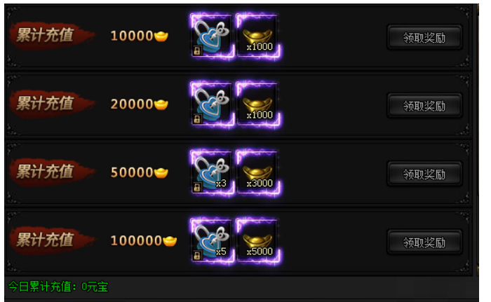 活动期间,每日累计充值指定数额元宝即可领取奖励!