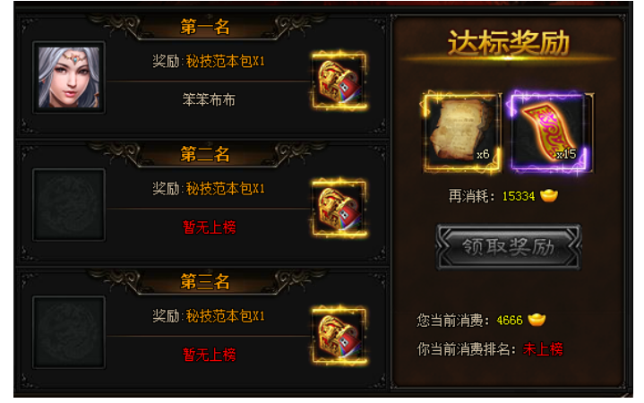 活动期间,累计消费20000元宝可获得达标奖励,消费第1、2、3名可获得排行奖励(至少消费50万元宝)!